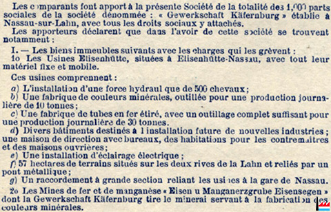 | Elisenhütte 500 PS Wasserkraft Mineralfarbenfabrik (10 t / Tag) Fabrique de tubes en fer étiré - Röhrenfabrik (30 t / Tag) Verschiedene Gebäude, Direktionsgebäude mit Büros, Wohungen für Vorarbeiter, Arbeiterhäuser Elektrische Lichtanlage 57 ha Fabrikgelände, beidseitig der Lahn, durch eine Metallbrücke verbunden Normalspuriger Gleisanschluss zum Bahnhof Nassau Eisen- und Maganerzgrube Eisensegen zur Herstellung von Mineralfarben (37 Ha Gruben, Besitz der Gewerkschaft Adolf, 99% der Anteile an dieser Grube gehören der Gewerkschaft Käfernburg, 1 % gehört Louis Godchaux der seinen Teil in die neue Gesellschaft einbringt) Eisen- und Maganerzgrube Käfernburg, bei Gotha (Thüringen) (40 Ha) Silex und Kaolin - Gruben Kaolin Kreselfeldes, in Niederselters (4 Ha) Carrière de terre réfractaire - Feuerfeste Erdegruben Kleinholbach, Wallmerod (4 Ha) Exklusivmonopol für Deutschland für das Patent N° 124824 Röhrenherstellungsverfahren (tubes en fer étiré) von Carl Twer sen., Köln - Verfahren zur Herstellung gescheißter Röhren kleineren Durchmessers |