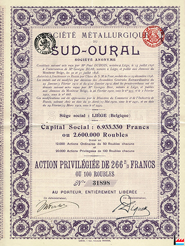 Action de la Société Métallurgique du Sud-Oural S.A. (Collection: industrie.lu)