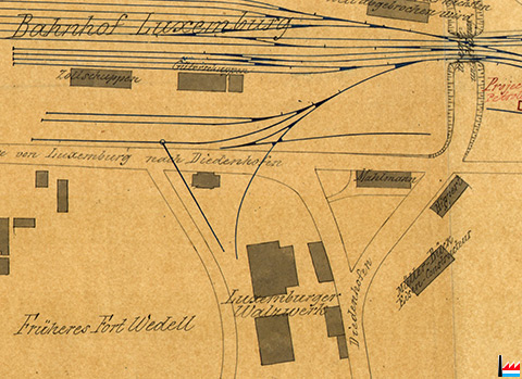 Bahnhof Luxemburg - Zollschuppen - Güterschuppen, Früheres Fort Wedell, Luxemburger Walzwerk, Mahlmann, Hippert, Muller - Buck, Eisen-Constructeur, Projectiertes Petroleum-Magazin - 1876 (Document: ANLux H811