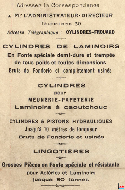 | 1918 | Absorption des Etablissements J. Munier et Cie, Frouard et Fonderies de Sougland (Aisne) et Pas-Bayard (Aisne)
