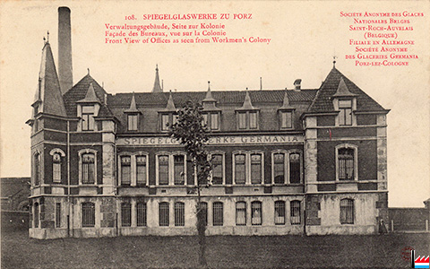 Spiegelglaswerke zu Porz: Verwaltungsgebäude, Fabrikseite (110bis) (Postkarte: