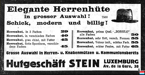| 5.1928 | Hutgeschäft Charles Stein, Luxemburg, jetzt, Großstraße 75, vis-à-vis der Apotheke Müller |