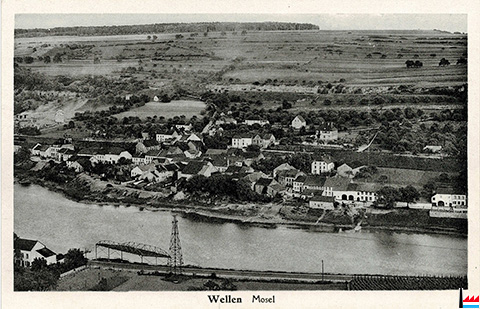 Seilbahn Grevenmacher (Luxemburg) - Wellen (Deutschland) mit Schutzbrücke auf der luxemburger Moselseite (Carte postale: Photo Sterba, Grevenmacher; collection industrie.lu)