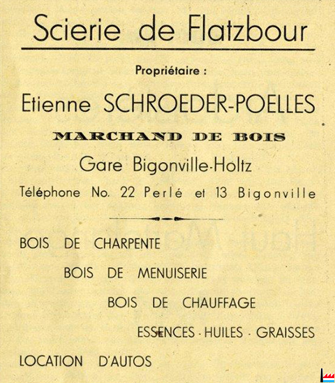 | <=1958 | Scierie - Comerce de bois Schroeder Etienne, succ. Jos. Kraus-Schroeder, Flatzbour, tél. 22 | ||