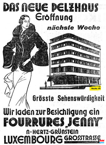 | 10.1932 | ![]() Das neue Pelzhaus Fourrures Jenny, Luxembourg, Grand-Rue - Eröffnung: nächste Woche - Publicité Studio 29 (LW: 22.10.1932) |
