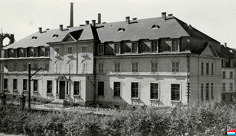 Cantine Ouvrière, Rumelange - HADIR Rumelange (aujourd'hui Kihn) au fond les cheminées de l'Usine de Rumelange - à gauche de l'entrée un poteau de caténaire du tramways TICE (Collection: industrie.lu)