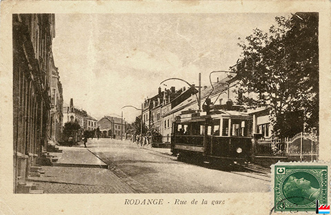 Rodange, rue de la Gare - Tramways TICE - 1935 (Carte postale: Edit R. Chansay; collection: industrie.lu)