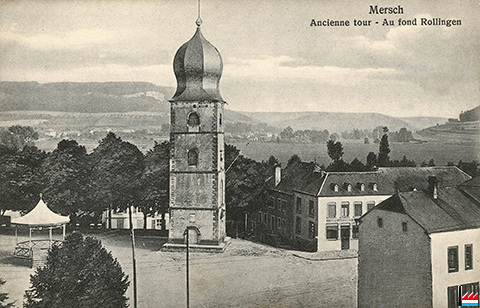 Mersch - Ancienne tour - Au fond Rollingen (Carte postale: Edition Theisen-Binsfeld, Mersch; Collection: industrie.lu)