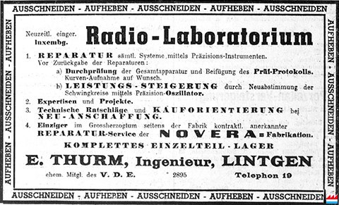 | <=1935 | ![]() Radio-Laboratorium Thurm Emile, ingénieur, Lintgen, tél: 19 (LW: 18.5.1935) ehemaliges Mitglied des V.D.E. Reparatur-Service der NOVERA - Fabrikation |