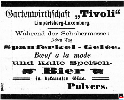 | 8.1885 | ![]() Gartenwirtschaft Tivoli, Limpertsberg, Propr. Pulvers (LIL: 30.8.1885) Während der Schobermesse: Spanferkel-Gelée, Bœuf à la mode und Kalte Speisen |