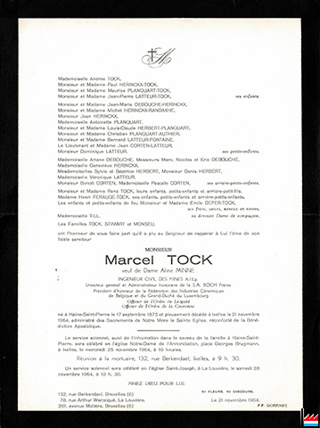 | Marcel Tock (* 17.9.1875 Haine-Saint-Pierre, + 21.11.1964 Ixelles), époux d'Aline Minne, ingénieur civil des mines A.I.Lg. | |