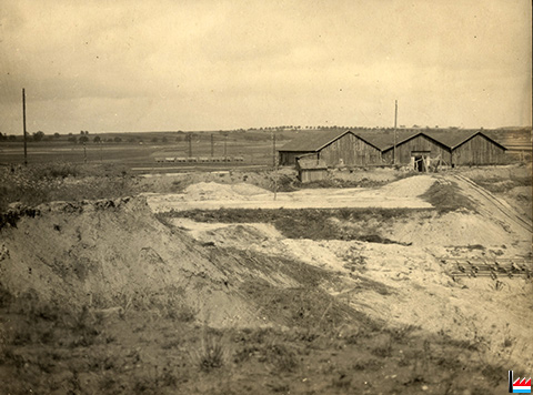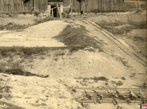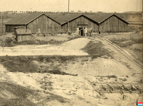 ![]() Tonschuppen bei Binsfeld Links neben den Schuppen sieht man im Hintergrund auch die Tonwaggons (der Kleinbahnlok Binsfeld-Phillipsheim). Vorne beim mittleren Schuppen wurden die Loren/Waggons mit einer Seilwinde aus der Grube in den Schuppen gezogen und dort zum Trocknen gelagert. (Sammlung: Wilhelm Schommer) |