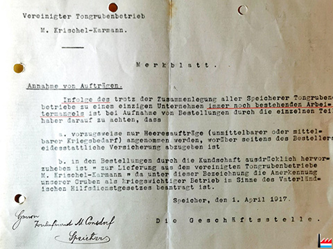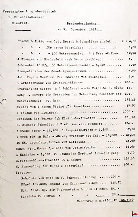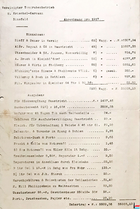 | 31.12.1917 | ![]() Vereinigter Tongrubenbetrieb M. Krischel-Karmann, Binsfeld - Bestandsaufnahme 31.12.1917 (Sammlung: Wilhelm Schommer) |