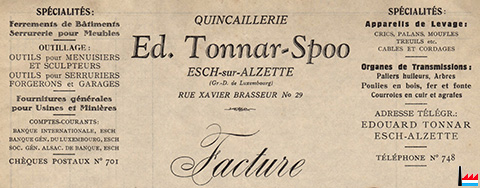 ![]() Quincaillerie Tonnar-Spoo - facture du 8.8.1952 (Collection: industrie.lu) F. & M. Tonnar Esch/Alzette |