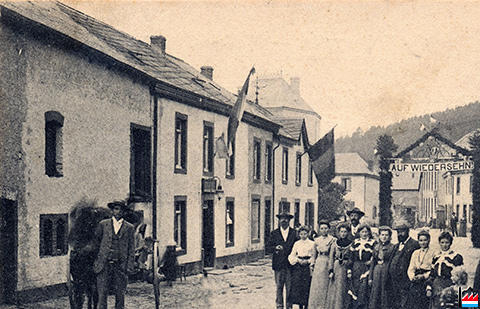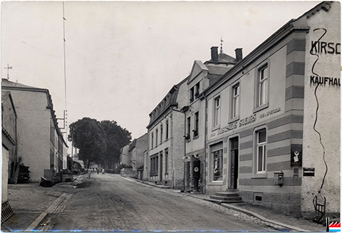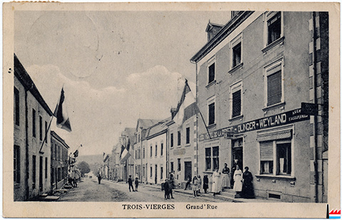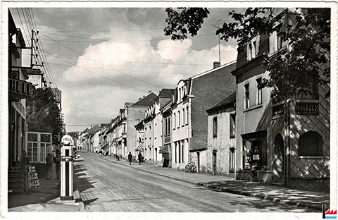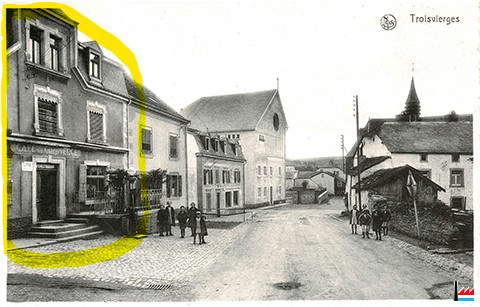 Rechts Café N. Schrantz, dat ass haut ee Wunnhaus op 5 rue de Wilwerdange L-9912 Troisvierges Lénks „Warenhaus E. Oberlinkels“, steet nach an haut sinn Appartementer dodran, dat ass haut op 2 rue de Wilwerdange L-9912 Troisvierges