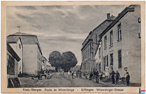 Rechts Café N. Schrantz, dat ass haut ee Wunnhaus op 5 rue de Wilwerdange L-9912 Troisvierges Lénks „Warenhaus E. Oberlinkels“, steet nach an haut sinn Appartementer dodran, dat ass haut op 2 rue de Wilwerdange L-9912 Troisvierges |
