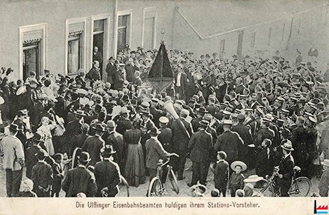 | 12.1910 | Ulflingen. 20. Dez. 1910 - Wie verlautet hat die Eisenbahn-Verwaltung die Gastwirtschaft Urbin mit 2 anstoßenden Gebäuden für 28.000 Mk. käuflich erworben. Sie soll dorthin den Personenbahnhof verlegen, was unserer Ortschaft zum großen Vorteil gereichen würde, da die vorhandenen Bahnhofräume dem bedeutenden Personenverkehr nicht mehr genügen. (LW: 20.12.1910) |