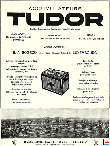 (...) Ce fut en 1889 que se fonda la Société Tudor pour la fabrication des accumulateurs. Jusqu’en 1901, ces derniers furent fabriqués à Rosport(Grand-Duché de Luxembourg) mais le développement de l’affaire engagea la Société à construire alors à Florival, où existait une chute d’eau de 100 HP., une usine qui se développa d’année en année. (…) |