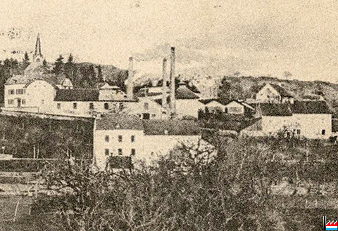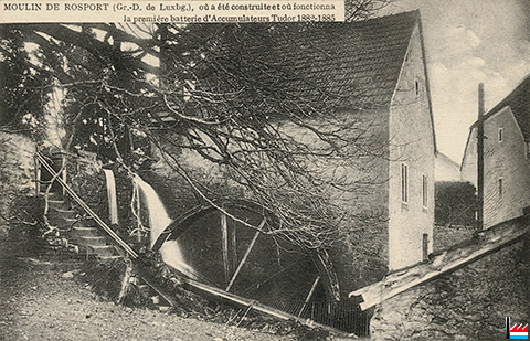 Mühle von Rosport, wo die erste Tudor-Akkumulatorenbatterie gebaut wurde und von 1882 bis 1885 in Betrieb war.