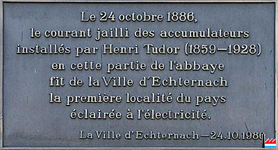 | 1881 | Henri Tudor est encore étudiant lorsqu'il réussit à transformer le modèle expérimental de Planté et Faure en produit industriel. Ce premier accumulateur Tudor fonctionnera pendant 16 années sans interruption, utilisant l'énergie produite par une dynamo qu'il a lui-même conçue et reliée au moulin à eau de Rosport. Le château de Rosport des Tudor sera ainsi, quatre années plus tard, une des premières demeures au monde équipée d'une installation hydro-électrique complète fonctionnant sans interruption. | ||