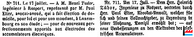 | fin des années 1870 | Henri Owen Tudor (* 1859 Dieschburg-Ferschweiler, + 31.5.1928 ) assiste aux différentes conférences de Planté et de Faure sur les accumulateurs électriques. | ||