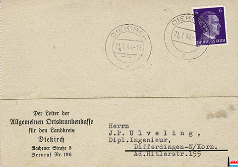 Leiter der Allgemeinen Ortskrankenkasse für den Landkreis Diekirch, Aachener Straße 5, Fernruf Nr. 186 an J.P. Ulveling, Dipl. Ingenieur, Differdingen - N/Korn (Niederkorn), Ad.Hitlerstraße 155