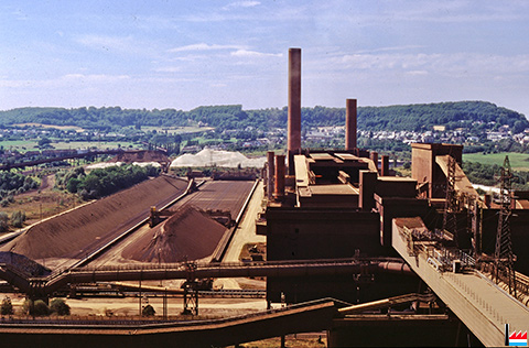| 3.1971 | Einweihung Sinterwerk - Agglomération Belval (e.a. site Source Bel-Val) 2,5 km langes Förderband (Belvaler Band) welches das Eisenerz aus Lothringen vom CRM (Centre de Répartition des Minerais) in Esch-Hoehl zur der Brech-Siebanlage bringt - bande transporteuse amenant le minerai lorrain depuis le CRM (Centre de Répartition des Minerais) à Esch-Hoehl Entladequai mit Lagerhalde für Übersee-Eisenerz Einrichtungen für das Entladen von Eisenerz, Koks, Zuschlagstoffen, etc. Erzbrechanlage - Siebanlage: in geschlossenem Kreislauf arbeitend, 2.200 t / h Bedding = Mischbettanlage, zum Mischung des Eisenerzes unterschiedlicher Qualität, mit 2 Lagerplätzen von je 200.000 t; 1 (später 2) Lagerhalden von je 500 x 40 m und einer Kapazität von 200.000 t