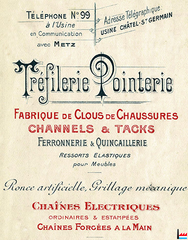 | <=1922 | ![]() Usine de Châtel-St-Germain, près Metz S.A. - <=1922 (Collection: industrie.lu) Tél.: 99 Tréfilerie - Pointerie Fabrique de clous de chaussures Channels & tacks Ferronnerie & Quincaillerie Ressorts élastiques pour meubles Ronce artificielle, grillage mécanique Chaînes électriques ordinaires & estampées Chaînes forgées à la main |