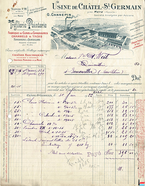 | 1922 | ![]() Facture de l'Usine de Châtel-St-Germain, près Metz S.A. - 30.6.1922 (Collection: industrie.lu) ![]() Lettre de change de l'Usine de Châtel-St-Germain, près Metz S.A. - 20.7.1922 (Collection: industrie.lu) |