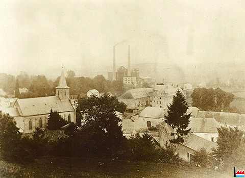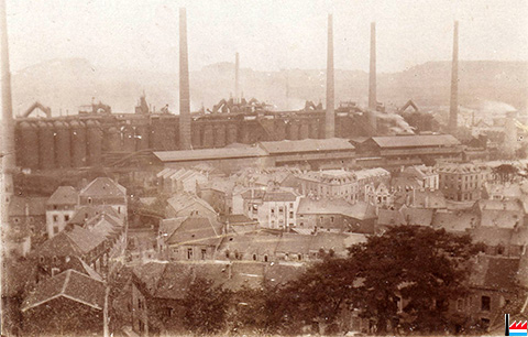 Differdingen im Jahre 1897. Im Hintergrund das Hüttenwerk mit de 2 ersten Hochöfen -