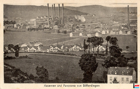Kasernen Oberkorn und Hütte Differdingen (Carte postale: Manufacture de cartes, p. Houstraas, Luxembourg, Rue des Augustins Nr.1; jmo)