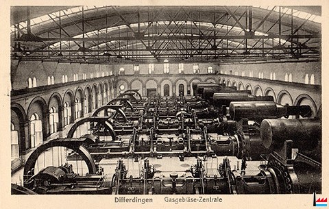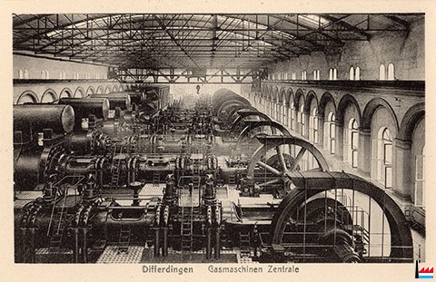 Hütte Differdingen - Gasmaschinenzentrale - Gasgebläsezentrale (Carte postale: Verlag Ch. Grieser, Hofphotograph, Luxemburg, 1916; collection: industrie.lu)