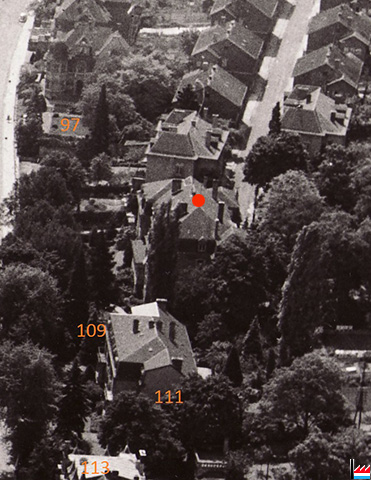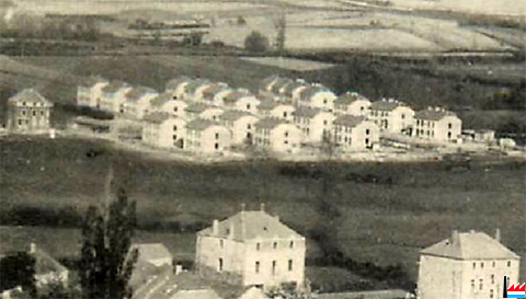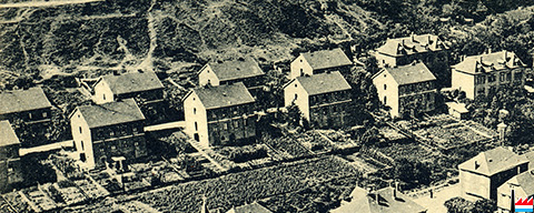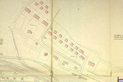 Colonie Stahlstraße - rue de l'Acier - 30.09.1913 (Situationsplan der Deutsch-Luxemburgischen Bergwerks und Hütten AG, Nationalarchiv Luxemburg). Do gesait een gutt dass daat verschwonnent Haus een Ensemble gebild huet mat der Kolonie. (Info: Christian Waltener)