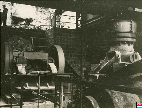 S.A. des Dolomies de Marche-les-Dames: Concasseur à machoires primaire ARBED Dommeldange CMR 85 et granulateur giratoire ARBED Dommeldange CG 12-15 - 1938 (Photo ADO; collection: industrie.lu)