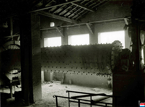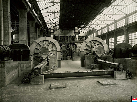 Société Belge d'Electrochimie, Langerbrugge: Tube broyeur triplex TC120 x 6 m ARBED Dommeldange 1929 - côté sortie du carbure broyé avec répartition dans les silos par vis transporteuse (Photo collection: industrie.lu)