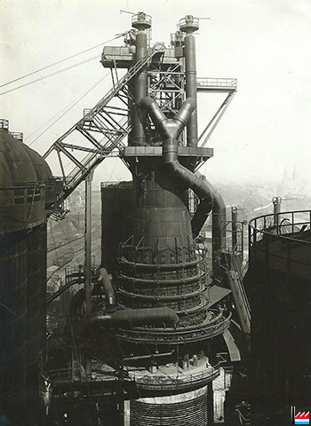 Oberer Teil eines neuen Düdelinger Hochofens. Solch ein Ofen erzeugt pro Tag 500.000 kg Roheisen. (Aus: Daten aus der Luxemburgischen Eisenindustrie, n° X. - Zusammengestellt von Camille Aschman, A-Z 1935-36