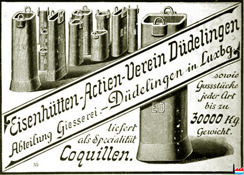 | <=1906 | ![]() Spezialität: Coquilles - Coquillen - ED - Eisenhütten-Actien-Verein Düdelingen - Abteilung Giesserei Gussstücke jeder Art bis 30.000 kg Gewicht (S&E N° 13 - 1906) |