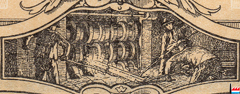 Gravure d'Eugène Kurth 1911 d'un convertisseur, d'un laminoir, etc. sur Part sociale au porteur des Aciéries Réunies de Burbach, Eich, Dudelange - 1.3.1912 - Imprimerie Th. Schroell, S.A., Luxembourg (Collection: industrie.lu)