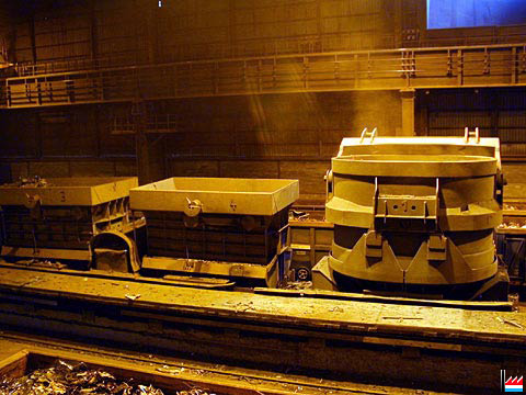 2 mélangeurs, d'une capacité unitaire de 1.000 t. 5 convertisseurs Thomas, d'une capacité de 32 t chacun, et le nouveau convertisseur LD-AC de 70 t. Dans la halle de démoulage, les 2 nouveaux fours pits chauffés, Au train blooming, les opérateurs transforment en deux minutes et demie un lingot de 6 t avec une section de 680 x 680 mm en un bloom d'une section carrée de 200 mm. Les cisailles électriques affranchissaient les deux bouts et un pont rotatif automatisé poset le bloom sur le train d'amenée du train à billettes. Les fours des vieux trains finisseurs Le nouveau train à billettes transforme un bloom de 200 mm, à travers huit cages, en billettes de 80 mm. Ces billettes sortent à une vitesse de 2 m/sec, et sont découpées automatiquement en barres de 9 m. Plus loin, les billettes sont transférées aux refroidisseurs, d'où elles sont reprises par des ponts roulants à aimants et déposées soit aux aires de stockage, soit aux étendages des fours à réchauffer des trains finisseurs. Au-delà des refroidisseurs, l'installation de contrôle à ultrason permet de détecter les défauts à l'intérieur des billettes et d'éliminer les billettes défectueuses. Les fours à réchauffer les billettes avec les installations d'inspection et d'enfournement ont des capacités de 80 t par heure et ils sont chauffés au gaz des hauts fourneaux préchauffé. |