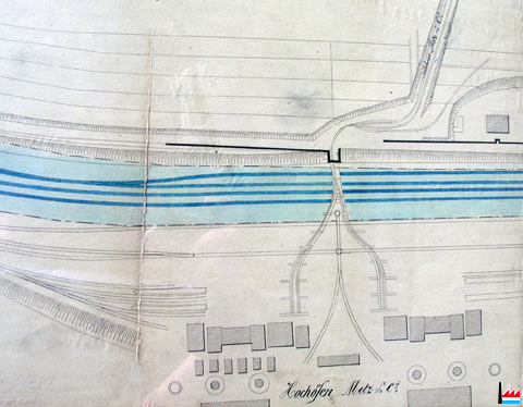 Links die Ladebühne (Quai) und Seilebene (Plan incliné) der Grube Lallingerberg der Gebrüder Servais & Cie, rechts die die Ladebühne (Quai) und Seilebene (Plan incliné) der Grube Lallingerberg von Metz & Cie, unten (in weiss) die Anschlussgleise der Metz-Hütte in Esch/Schifflange (Plan: 7.9.1873 Salentiny)