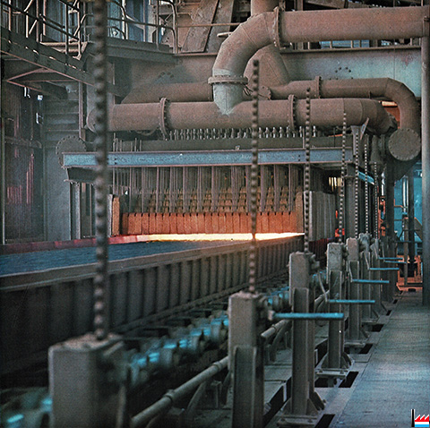![]() Machine d'agglomération (Huntington-Heberlein) de l'Usine de Rodange Longueur sous dépression: 48,80 m Largeur: 2,44 m Capacité de production: 100 t d'aggloméré / h Allumage: 3 rangées de 22 brûleurs, alimentés par un mélange de gaz de haut fourneau et de gaz naturel |