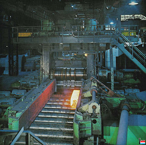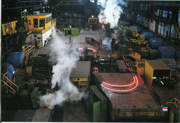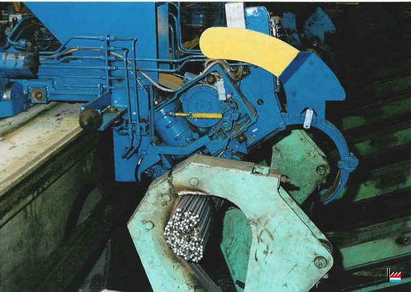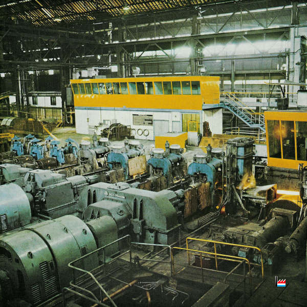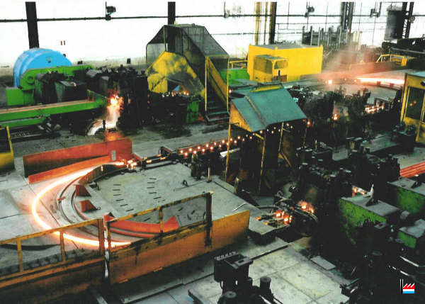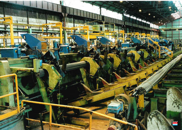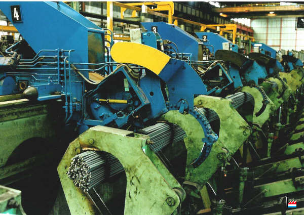 | 4.11.1969 | Nouveau four poussant OFU pour chauffer des billettes de 80 x 80 à 100 x 100 mm, capacité 100 t/h, longueur 9,1 m. Utilisation du gaz naturel pour la première fois à l’usine. Ajout de 4 cages SCHLOEMANN supplémentaires au dégrossi. (17 cages duo dont 4 dégrossisseurs de 450 mm de diamètre et 13 cages de 16" et 14" Remplacement des moteurs électriques, nouveau refroidissoir SCHLOEMANN pour ronds, longueur 85 m, mise en service d’un bottelage semi-automatique DEMAG au magasin. |