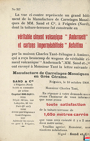 ![]() Manufacture de Carrelages Mosaïques en grès cérame Sand et Cie à Feignies - Lettre du 5.4.1913 (Collection: industrie.lu) |