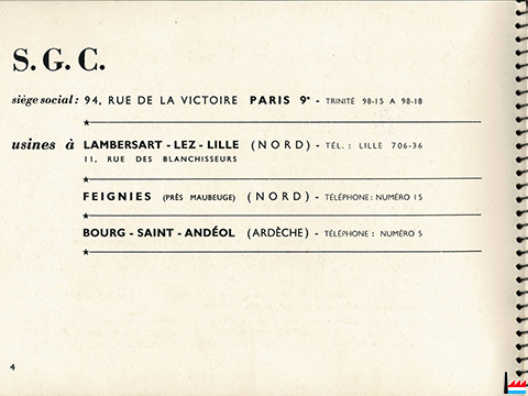| <=1952 | ![]() Catalogue de la Société Générale de Carrelages et de Produits Céramiques - S.G.C. - 39 pages - 12.1952 (Collection: industrie.lu) Usines, e.a. à :
