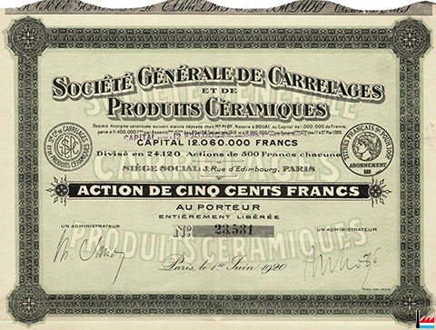 | <=1921 | Société Générale de Carrelages et Produits Céramiques (Anciens Etablissements Sand & Cie, Simons & Cie; Jean van Overstraeten; Lauzun; Blachère & Cie, Villeneuve-de-Berg (<=1913: Manufacture Générale des Carrelages Larmande de l'Ardèche - J. Blachère & Cie, Villeneuve-de-Berg, usines à St Jean Le Centenier et Villeneuve-de-Berg; De Speyr) - usines à Canteleu Lambersart-lez-Lille, Feignies (Nord), Le Cateau (Nord), Bourg-Saint-Andéol (Ardèche), Villeneuve-de-Berg (Ardèche) et St Jean Le Centenier (Ardèche)![]() Société Générale de Carrelages et de Produits Céramiques, Paris, 3 rue d'Edimbourg - action de 500 fr au porteur - 1920 (Collection: industrie.lu) |