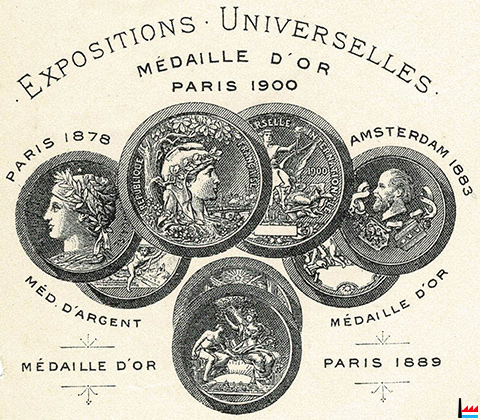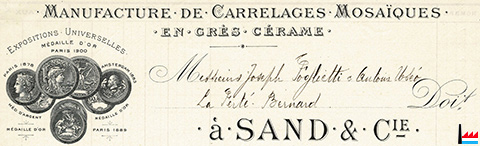 ![]() Expositions Universelles: Paris 1878, Amsterdam 1883, Paris 1889, Paris 1900, Paris 1900 - Manufacture de Carrelages Mosaïques Sand et Cie à Feignies - sur facture du 5.4.1913 (Collection: industrie.lu) |