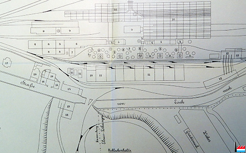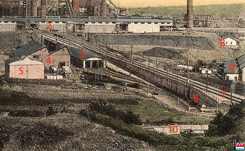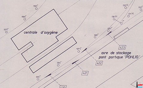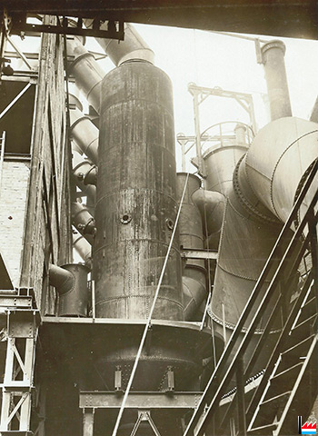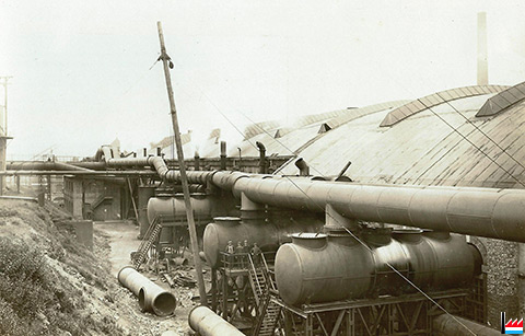 Die 3 Escher Werke (Belval, Terre-Rouge, Esch-Schifflange) sind durch Gasleitungen miteinander verbunden, hier in Terre-Rouge? (Aus: Daten aus der Luxemburgischen Eisenindustrie, n° IX. - Zusammengestellt von Camille Aschman, A-Z, 1935 - Collection famille Aschman-Bodson)