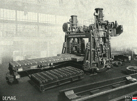 Cage de train duo 920, pour tôles de cuivre / Société de l'Usine à cuivre et à tubes, ci-devant Rosenkrantz à Petrograd (Dans : DEMAG - Deutsche Maschinenfabrik A.G., Duisburg - LE LAMINOIR, catalogue de 1918, p. 222. - Collection Philippe Aschman)