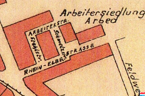 ARBED - Arbeitersiedlung: Arbeiterstraße (Arbeitsstraße / rue du Travail, Cité Dr. Welter B), Rhein-Elbestraße (Cité Dr. Welter A) - Stahlstraße (rue de l'Acier / Cité Dr. Welter C) - Schmelzstraße (rue des Fondeurs / Cité Dr. Welter D) (Karte 1940/44; Collection: Marcel Schlim)