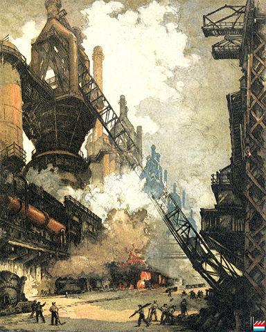 Radierung der Hochofengruppe von Karl Schwetz (VÖEST Jahrbuch 1950/51, ohne Seitenangabe)